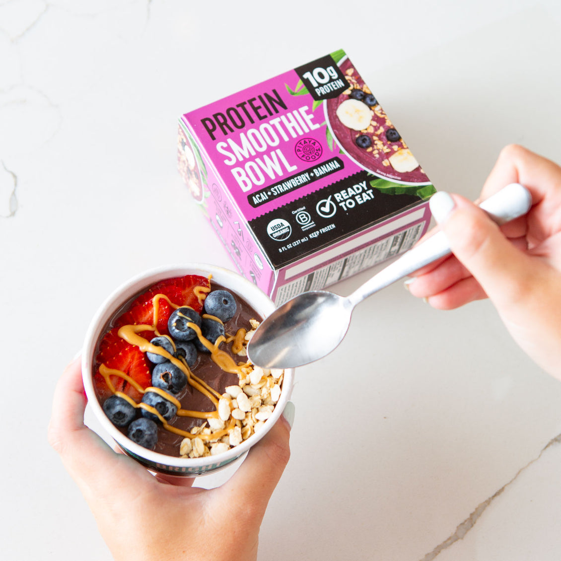Our protein smoothie bowls don’t require a microwave or a long wait before eating. Just grab a spoon and enjoy.